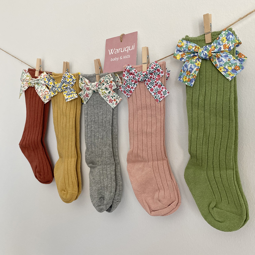 Calcetines con lazo de flores. Quedan a la altura de las rodillas del bebé.